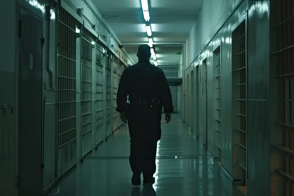 Policial penal realizando plantão noturno em unidade prisional.